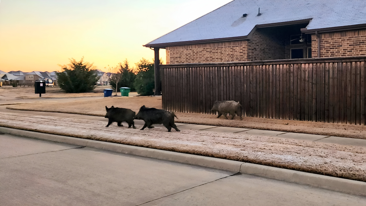 Officials estimate that tens of thousands of pigs roam the state, feeding on crops and nesting in creek beds that back up to homes. Residents describe waking to rooted lawns — proof that the invaders are already inside the fence line.